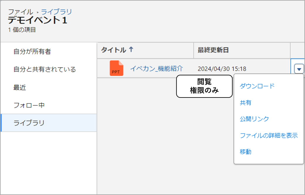 - 【Salesforce版・SaaS版】アクセスレベルを設定することで、ユーザに応じてファイル操作を制限することが可能です。