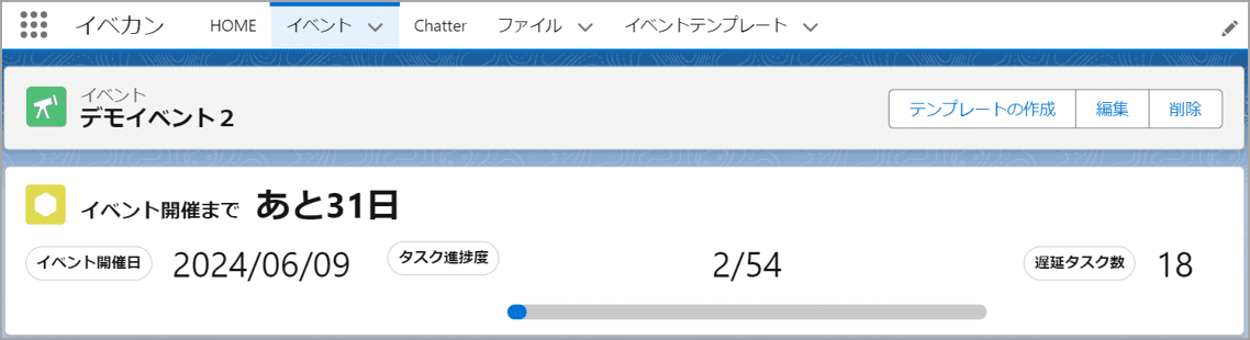 - 【Salesforce版】イベントの総タスク数や完了しているタスクを一目で確認できます。