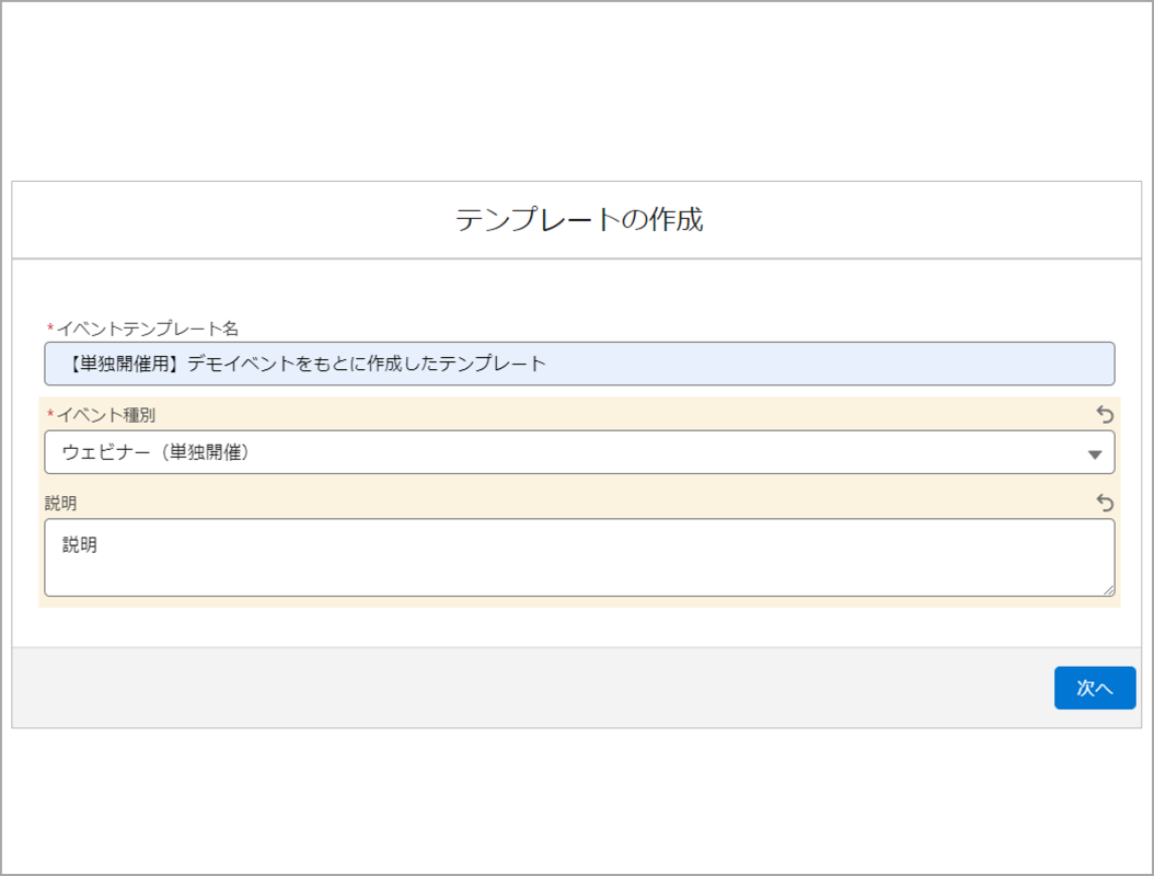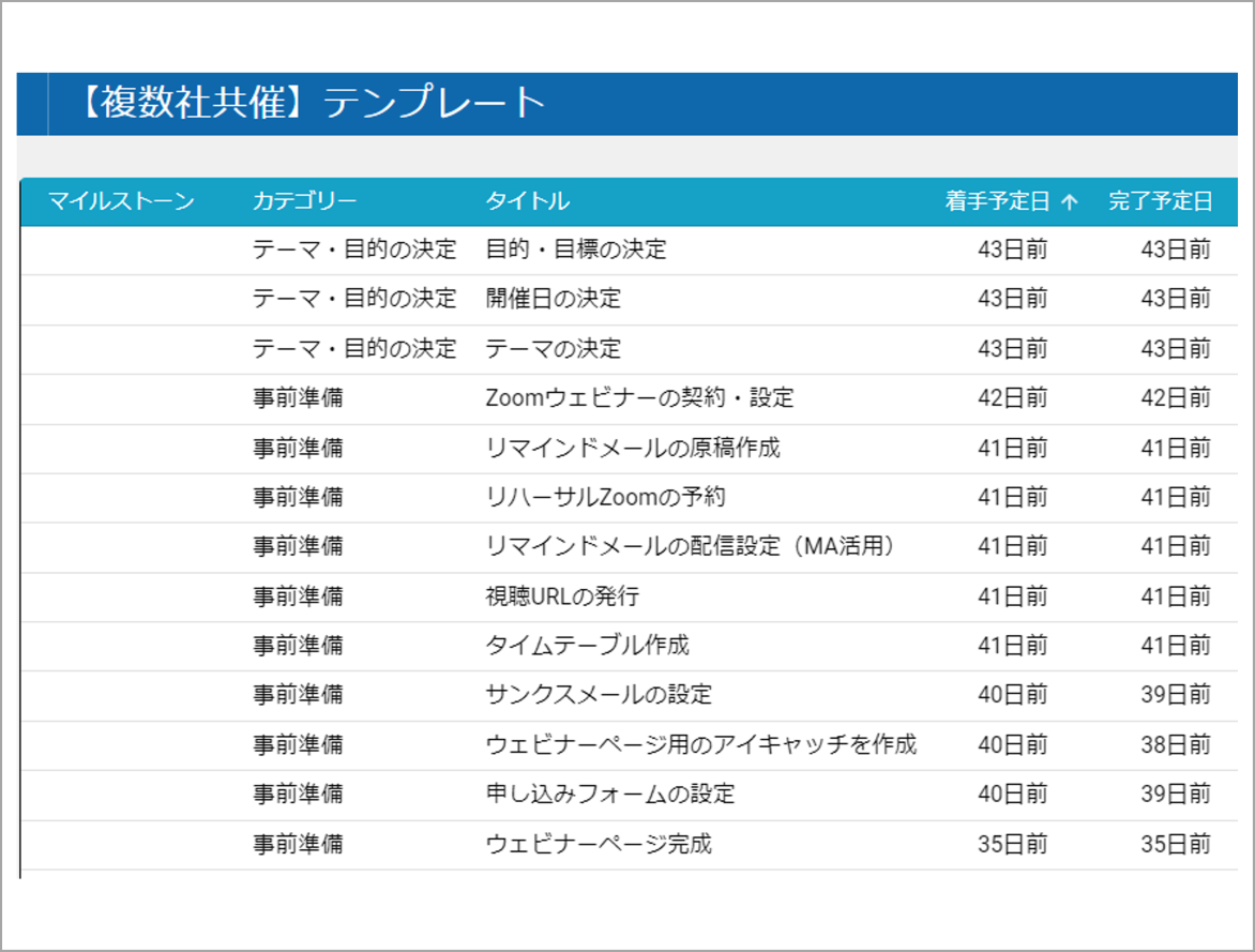 - イベカンではオンラインウェビナー開催向けの標準イベントテンプレートが用意されています。ウェビナー開催に必要なタスクが網羅されており迷わずイベント開催に向けた準備が可能です。