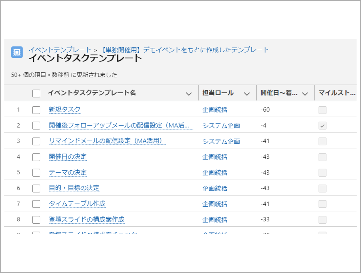 - 作成したイベントタスクはテンプレート化することができます。テンプレート化したイベントをもとに、イベントのタスクを生成できます。