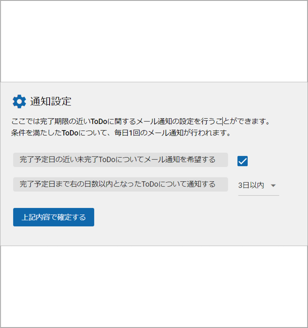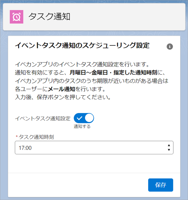 - タスク通知設定をすると、月曜日から金曜日の設定時刻に自分が担当するイベントのうち、期限の近い未完了のタスクを、メールにてユーザーに通知できます。